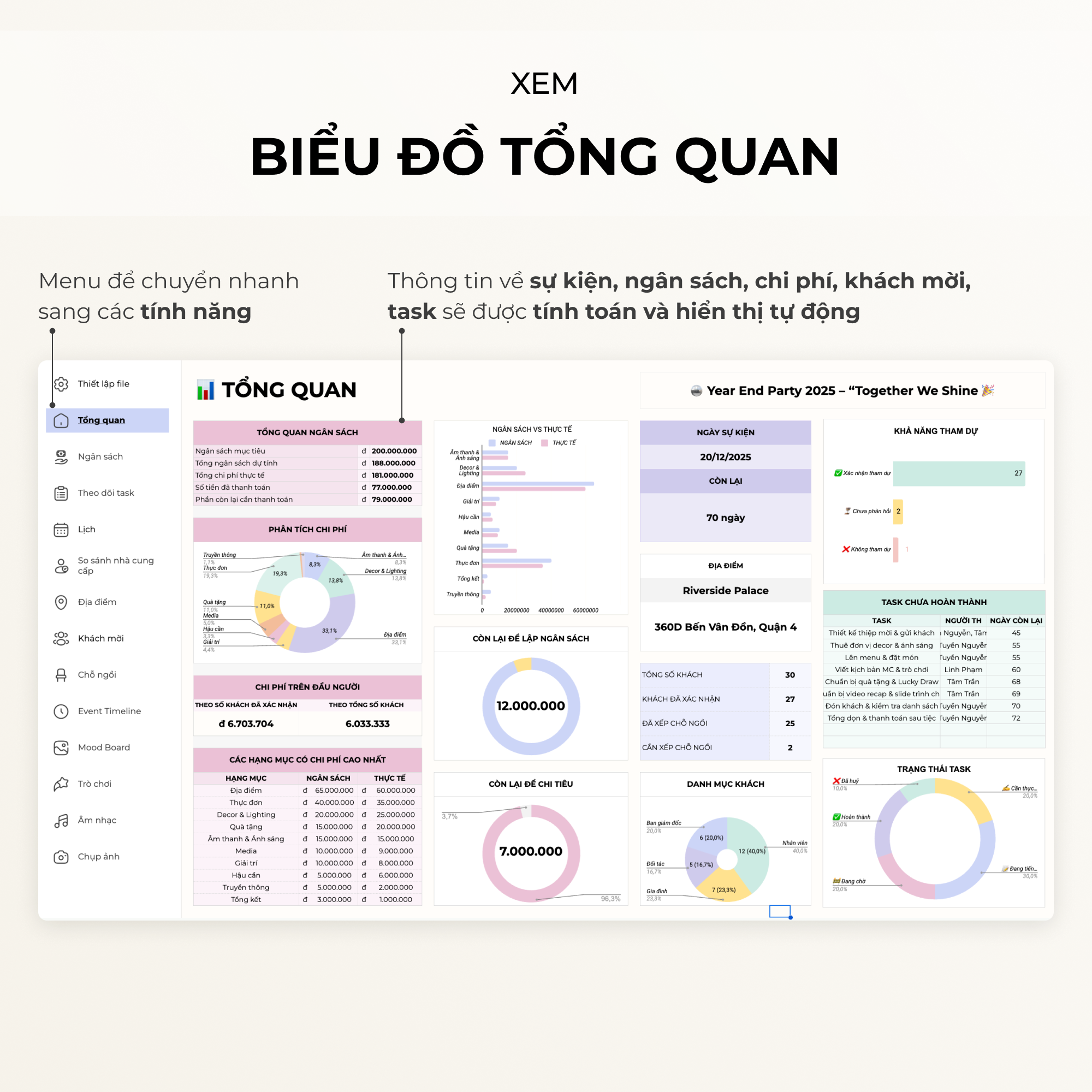 • File tự động lập biểu đồ và hiển thị thông tin của sự kiện về ngân sách, chi phí, task, khách mời, địa điểm.