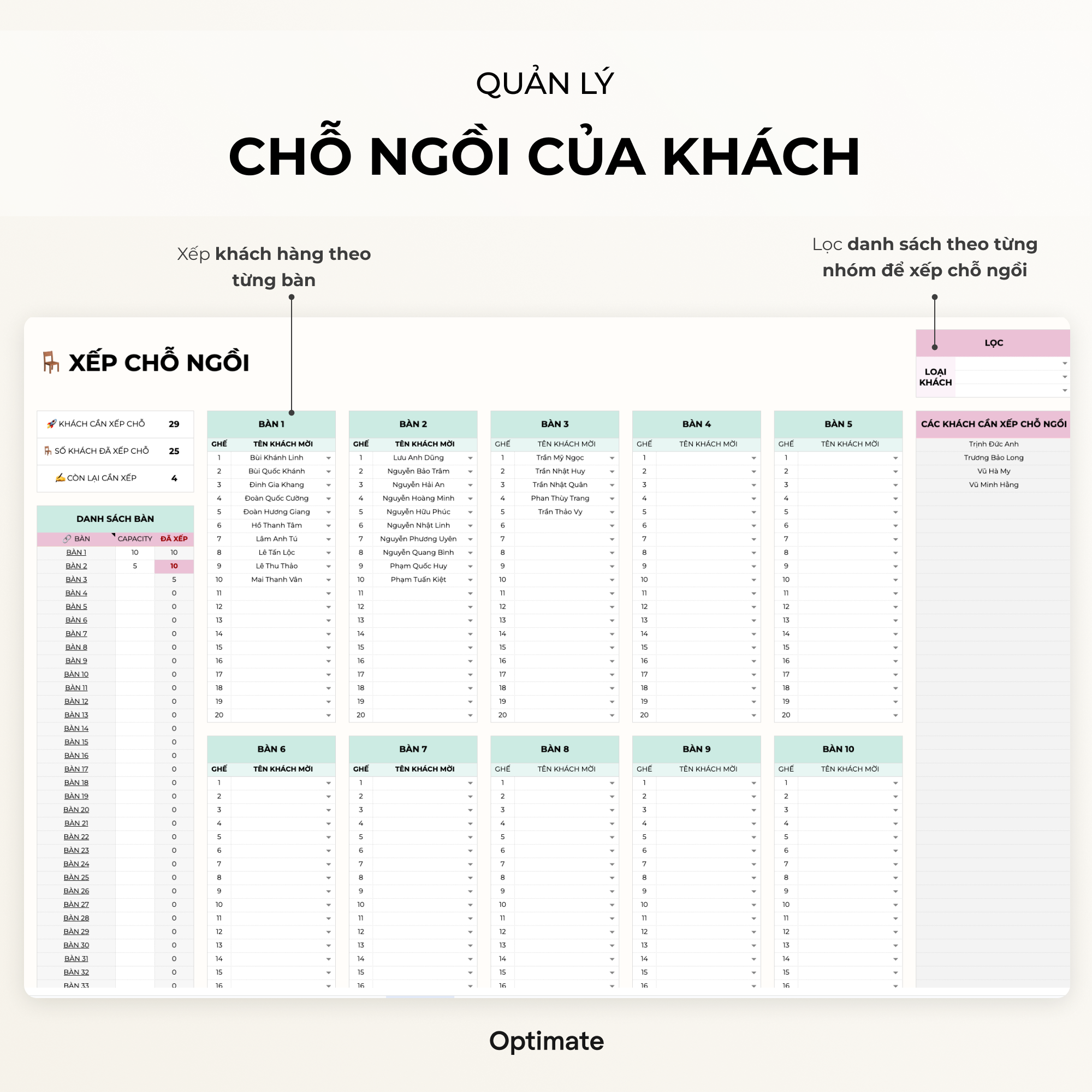 • Dựa trên danh sách khách mời, có thể xếp chỗ cho từng khách theo bạn nếu muốn.